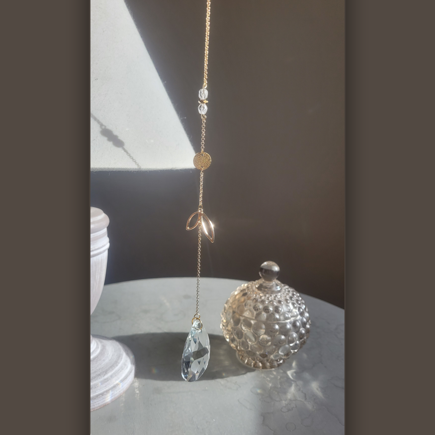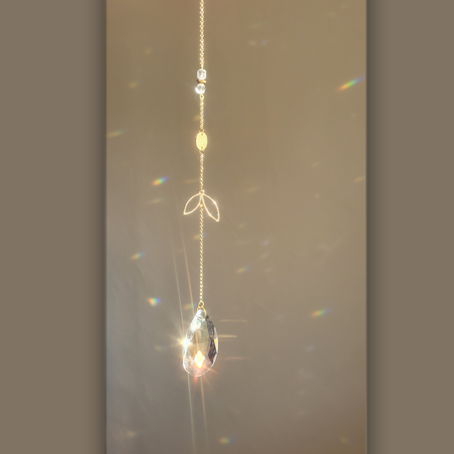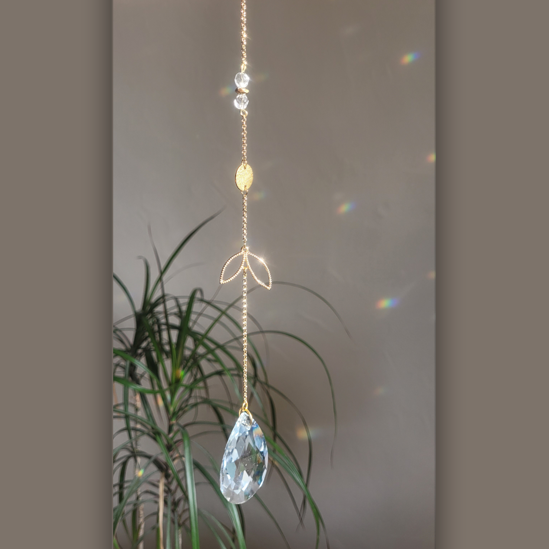 Au centre, une goutte de cristal AAA de 5 × 3 cm transforme la lumière en arcs-en-ciel délicats,