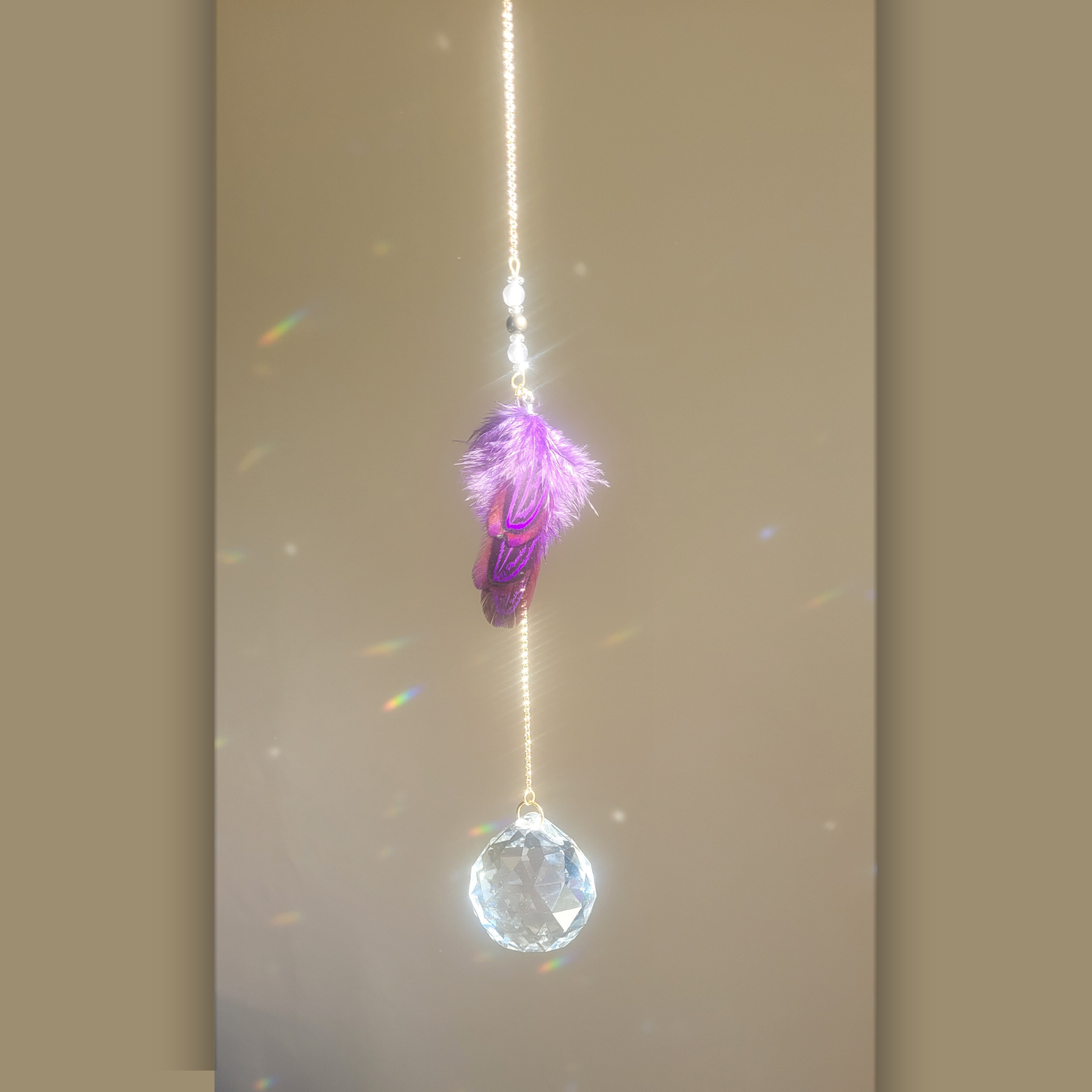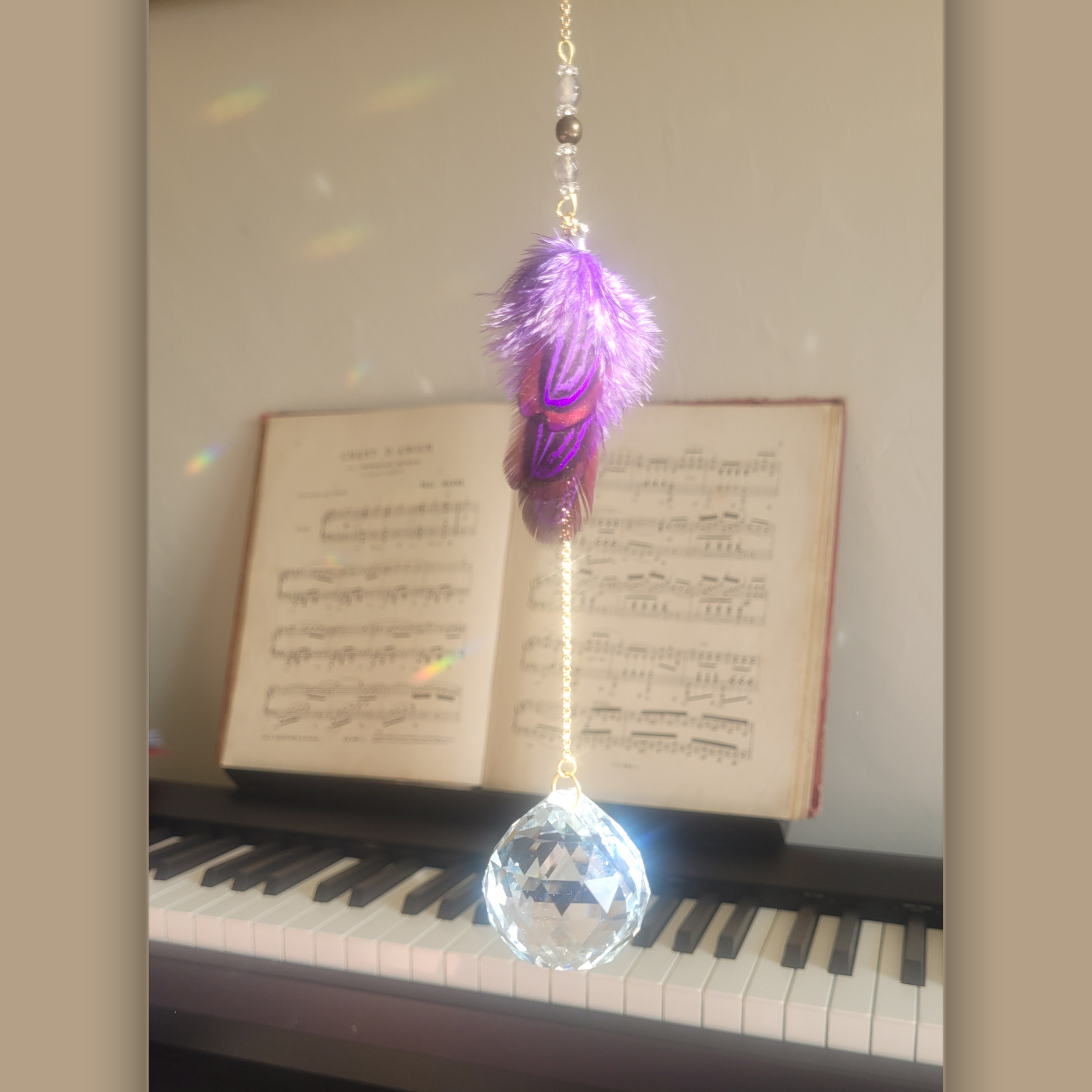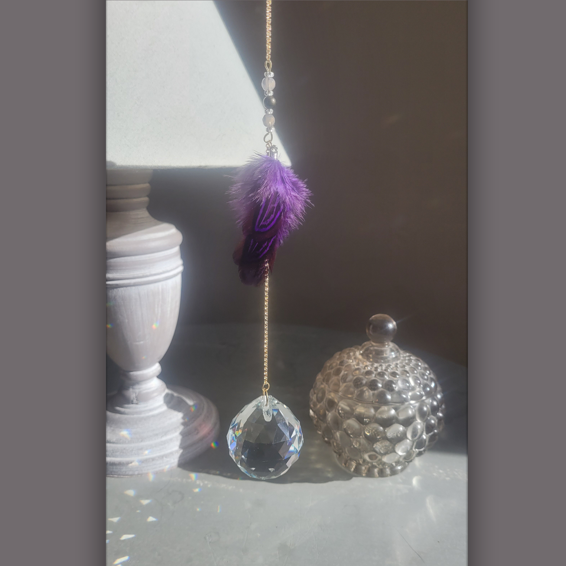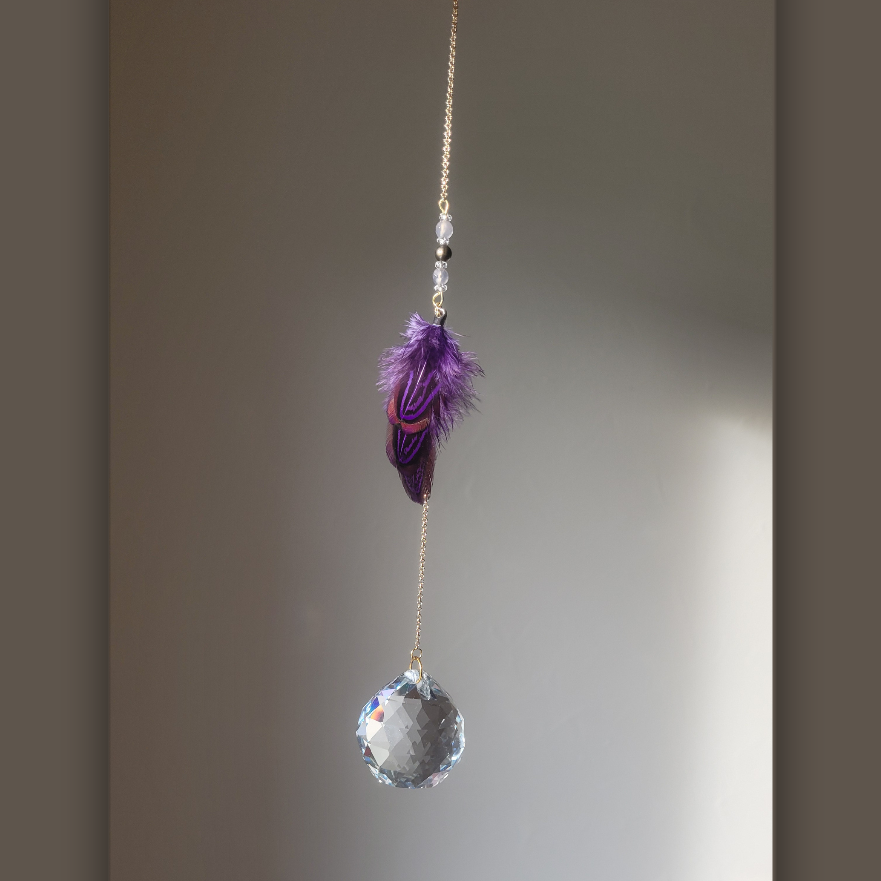 Un voile de nuit profonde s’éveille en reflets changeants, comme un secret que seule la lumière sait murmurer. Une triple plume pourpre, veloutée et intense, flotte avec grâce au-dessus d’un cristal sphérique parfait,
